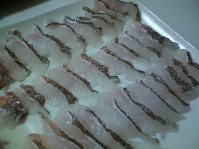 ウッカリカサゴは三枚におろして身は皮付きのままそぎ切りに。