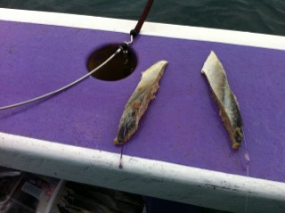 エサはサンマの切り身。