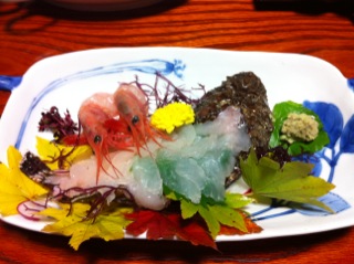 もちろん魚の刺身もありまっせ。オコゼ&甘エビ