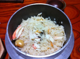 カニの釜飯。一口食ったが腹が一杯でオニギリにしてもらった。