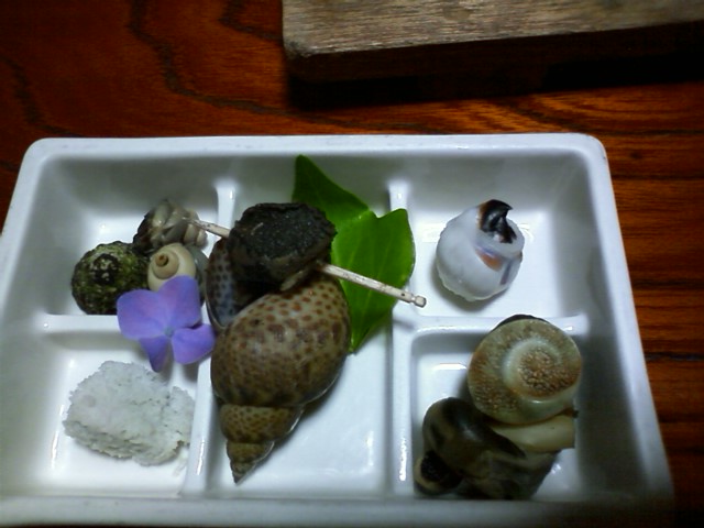 あずき貝、サザエ、たこの卵、たこのクチバシ、と地元の貝(失念)