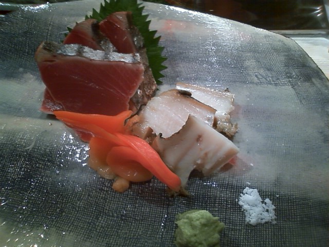 カツオのたたき、クロあわびの酒蒸し、アオヤギ
